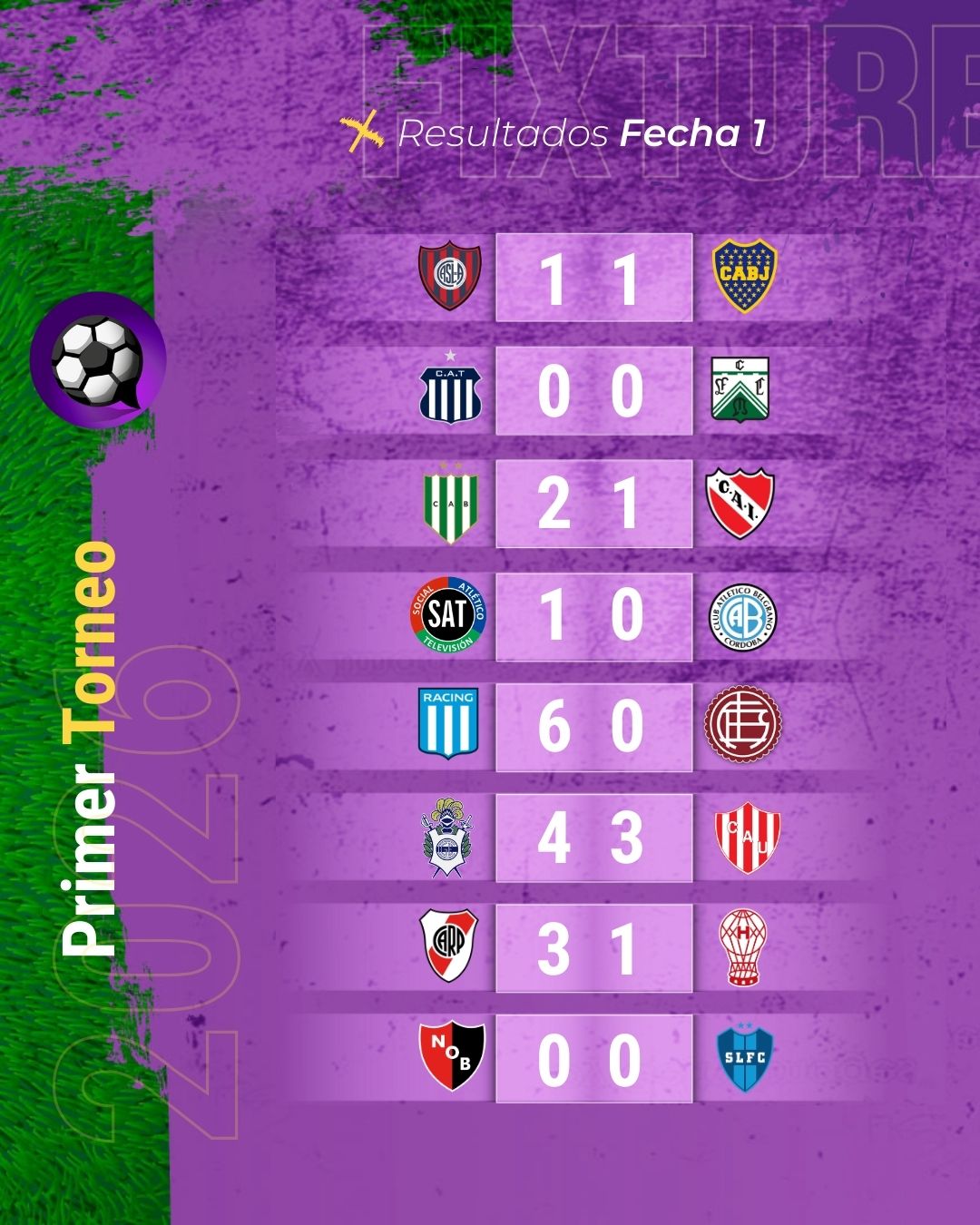 Por su parte, el domingo se dieron cinco encuentros para terminar de cerrar la fecha 1. El campeón del torneo apsado, Belgrano, perdió 1-0 con SAT en Moreno y el subcampeón, Racing, goleó 6-0 al reciente ascendido Lanús.